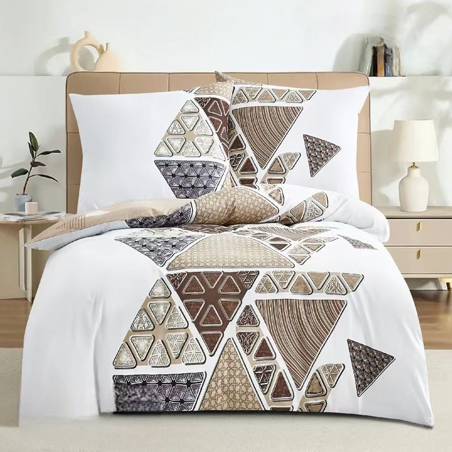 Trójkąty wypełnione różnorodnymi deseniami w palecie brązów, beżów i szarości tworzą dynamiczny, przestrzenny wzór. Całość umieszczono na gładkim, białym tle, co podkreśla nowoczesny charakter pościeli.