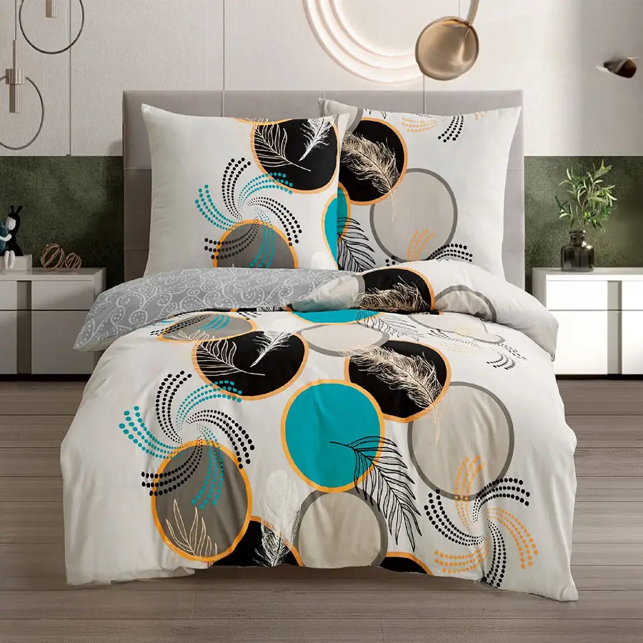 Energetyczny deseń tego kompletu opiera się na kontraście między jednolitymi kołami w kolorach turkusu, czerni i szarości a lekkością rysunkowych piór. Paletę barw uzupełniają akcenty w kolorze musztardowej żółci i dynamiczne łuki z kropek. To niezwykle oryginalna i nowoczesna propozycja do sypialni.