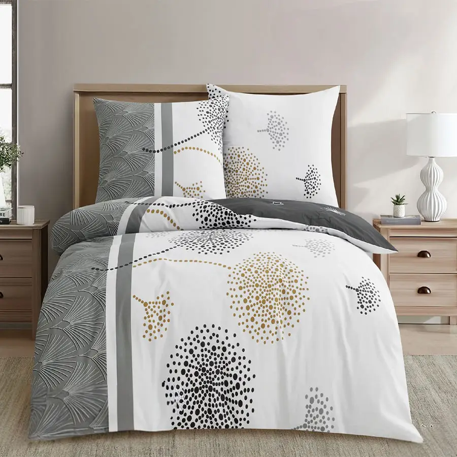 Pościel bawełniana 140×200 wzór 8059 to doskonały wybór dla osób, które cenią wysoką jakość, komfort oraz stylowy wygląd sypialni. Została wykonana w 100% z bawełny o satynowym splocie, dzięki czemu jest miękka, przewiewna i przyjemna w dotyku. Kontrast między minimalistycznym motywem dmuchawców a bogato zdobionym, szarym panelem w stylu Art Deco. Kropkowane linie w kolorze złota i czerni łączą obie części, tworząc spójną i dynamiczną całość. Jednolity, grafitowy rewers doskonale dopełnia ten stylowy komplet.