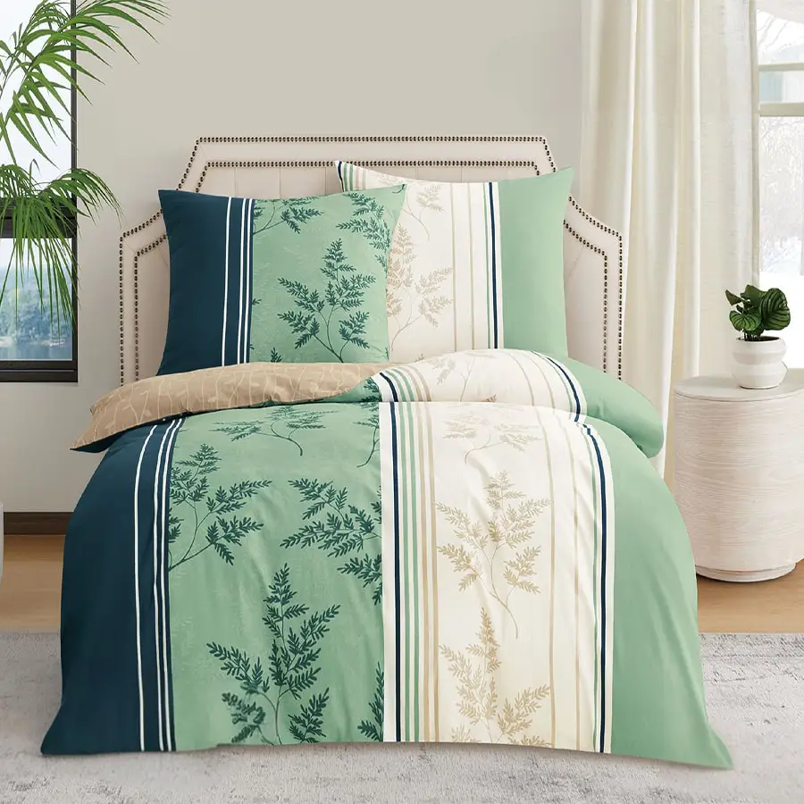 Panelowa kompozycja tego wzoru dzieli pościel na szerokie, pionowe strefy, tworząc uporządkowany i elegancki deseń. Na blokach w kolorze szałwiowej zieleni i kremowej bieli umieszczono delikatne gałązki paproci. Całość oddzielają pasy w odcieniach granatu, zieleni i beżu, a ciepły, beżowy rewers stanowi idealne dopełnienie.