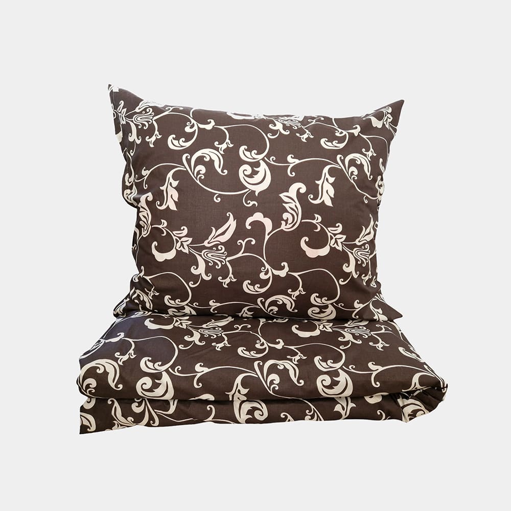 Wzór prezentuje klasyczny, roślinny ornament w kolorze złamanej bieli, który wyraźnie odznacza się na głębokim, brązowym tle. Dynamiczne zawijasy i stylizowane liście tworzą gęstą, pełną elegancji kompozycję na całej powierzchni pościeli. To ponadczasowe połączenie kolorystyczne nadaje wnętrzu wrażenie luksusu i ciepła.