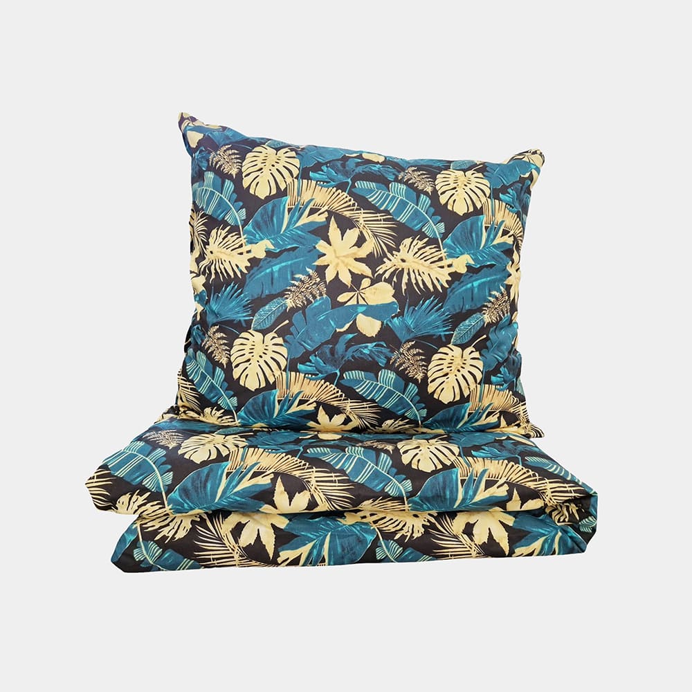 Pościel bawełniana 160×200 wzór 1015 to idealny wybór dla osób, które cenią wygodę, jakość i elegancki wygląd sypialni. Przedstawia gęstą, egzotyczną dżunglę liści na głębokim, niemal czarnym tle. Na pierwszy plan wysuwają się liście monstery i palmy w odcieniach intensywnego turkusu oraz musztardowej żółci. To wyraziste i odważne połączenie kolorów wnosi do sypialni energię oraz powiew tropikalnej świeżości.