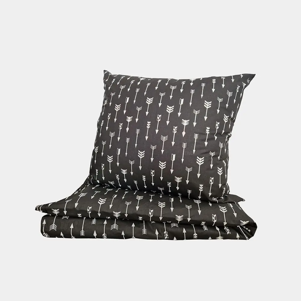Pościel bawełniana 160×200 wzór 1028 to idealny wybór dla osób, które cenią wygodę, jakość i elegancki wygląd sypialni. Minimalistyczny deseń złożony z rytmicznie ułożonych, białych strzałek na tle w kolorze antracytu. Prosta, dwukolorowa kompozycja jest niezwykle stylowa i uniwersalna, pasując do wielu nowoczesnych aranżacji. Graficzny motyw świetnie sprawdzi się zarówno w sypialni dorosłej, jak i młodzieżowej.