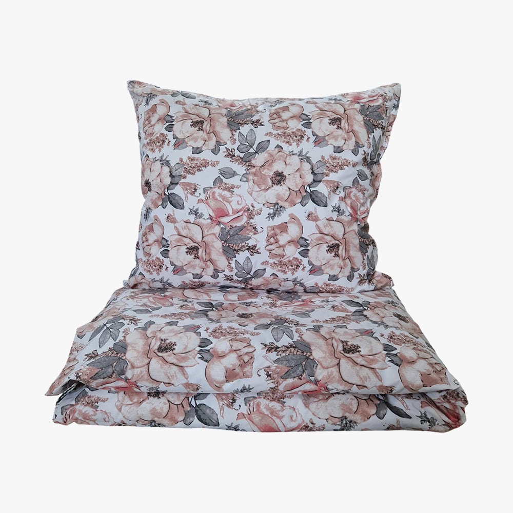 Elegancki wzór przedstawiający bujne kwiaty w odcieniach pudrowego różu i łososia, skontrastowane ze szkicowanymi, szarymi liśćmi. Ta romantyczna kompozycja na białym tle nadaje sypialni klasycznego uroku i delikatności.