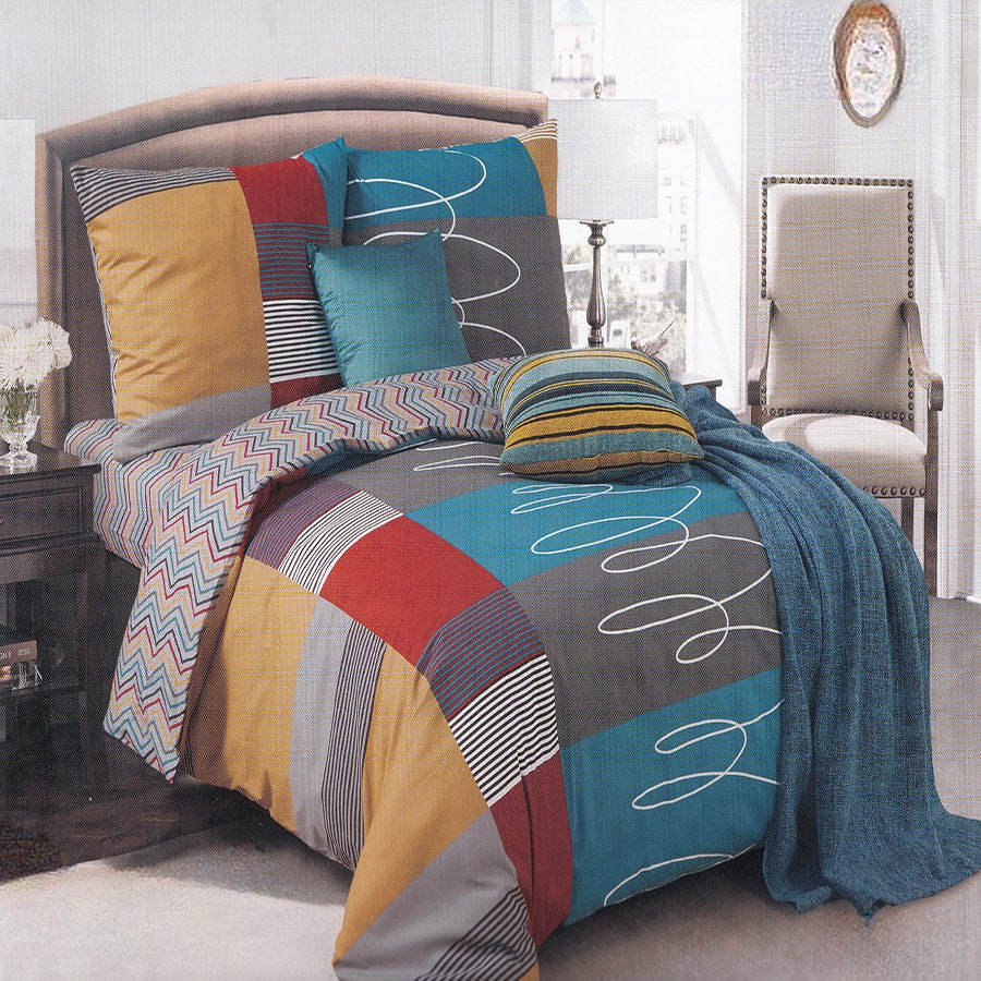 Abstrakcyjna mozaika złożona z szerokich, kolorowych pasów oraz geometrycznych wzorów w odcieniach turkusu, żółci i czerwieni. Całość dopełniają czarno-białe paski i fantazyjna linia, co sprawia, że pościel jest idealnym dodatkiem do nowoczesnej sypialni.