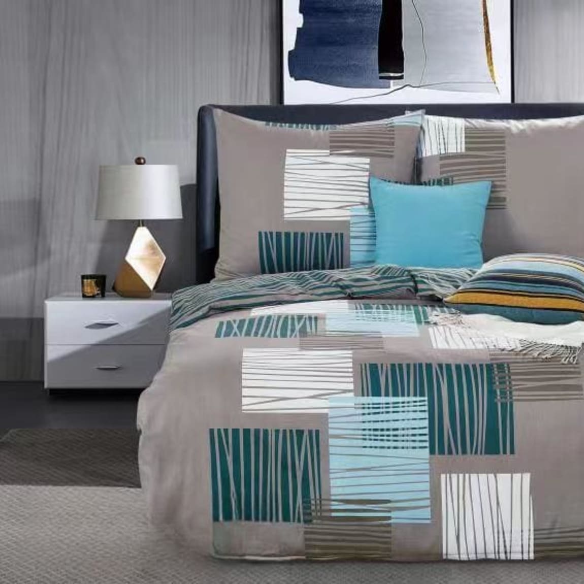 Nowoczesny, geometryczny wzór składający się z kwadratów wypełnionych abstrakcyjnymi liniami w kolorach turkusu, błękitu i bieli. Całość osadzona na ciepłym, beżowym tle tworzy harmonijną kompozycję idealną do sypialni w stylu modernistycznym.