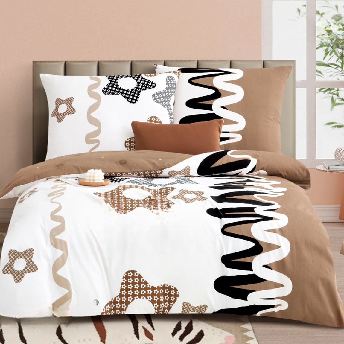 Nowoczesny wzór w ciepłej kolorystyce łączy abstrakcyjne, faliste linie oraz stylizowane gwiazdki na czysto białym tle. Duży blok w kolorze kawy z mlekiem z dekoracyjną, zygzakowatą oblamówką tworzy dwustronną kompozycję idealną do sypialni urządzonych w stylu boho lub minimalistycznym.