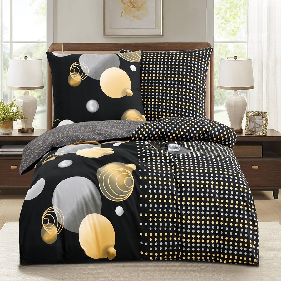Pościel bawełniana 160×200 wzór 8009 to doskonały wybór dla osób, które cenią wysoką jakość, komfort oraz stylowy wygląd sypialni. Została wykonana w 100% z bawełny o satynowym splocie, dzięki czemu jest miękka, przewiewna i przyjemna w dotyku. Złote i szare, trójwymiarowe kule oraz graficzne okręgi zdobią jedną stronę pościeli na czarnym tle. Druga strona przedstawia regularny wzór w kropki w dopasowanej, złoto-szaro-białej kolorystyce.