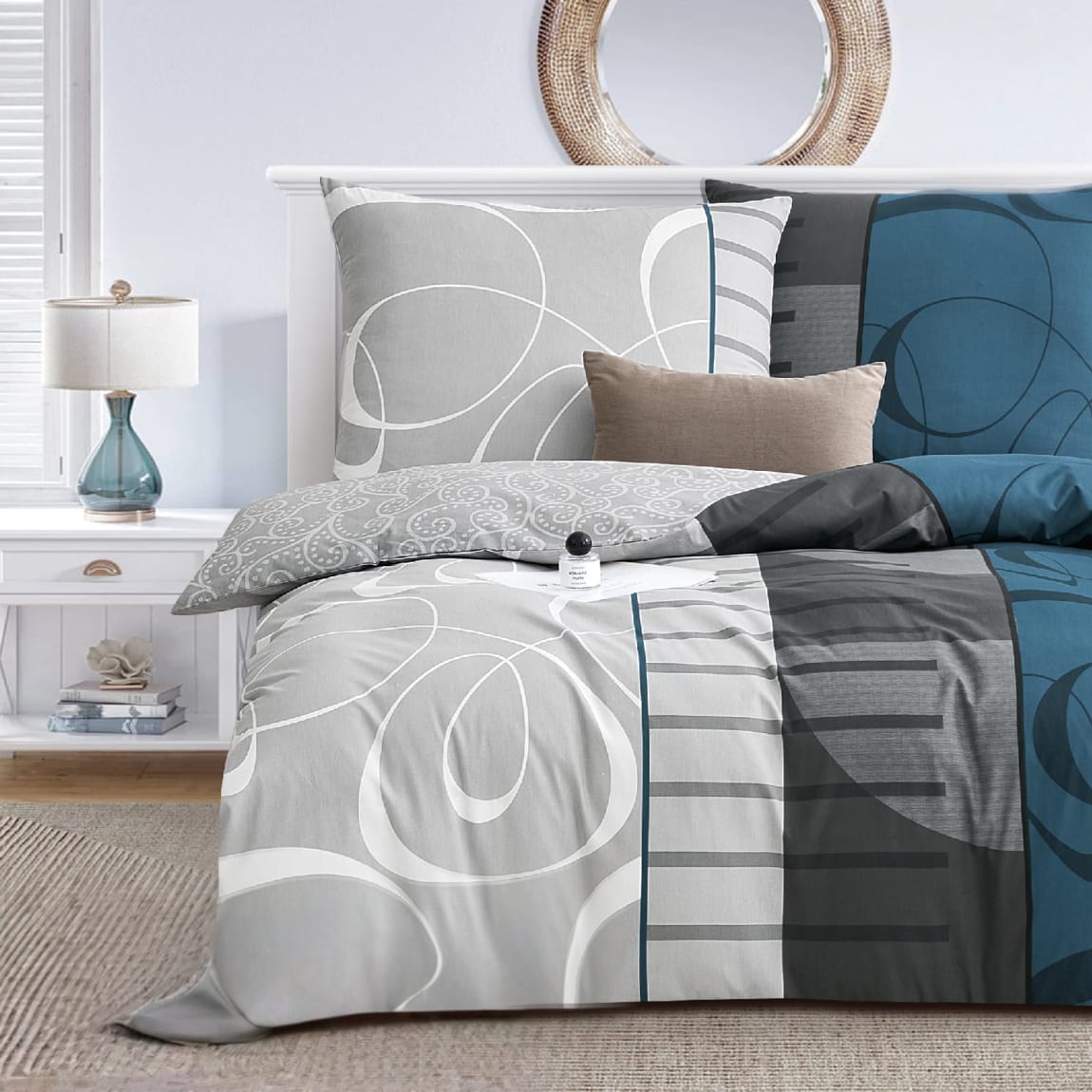 Nowoczesny i dynamiczny wzór łączy falujące, abstrakcyjne linie z geometrycznymi pasami i blokami w chłodnej kolorystyce. Kontrastowe zestawienie jasnej szarości z głębokim turkusem i grafitem nadaje sypialni wyrazistego, współczesnego charakteru.