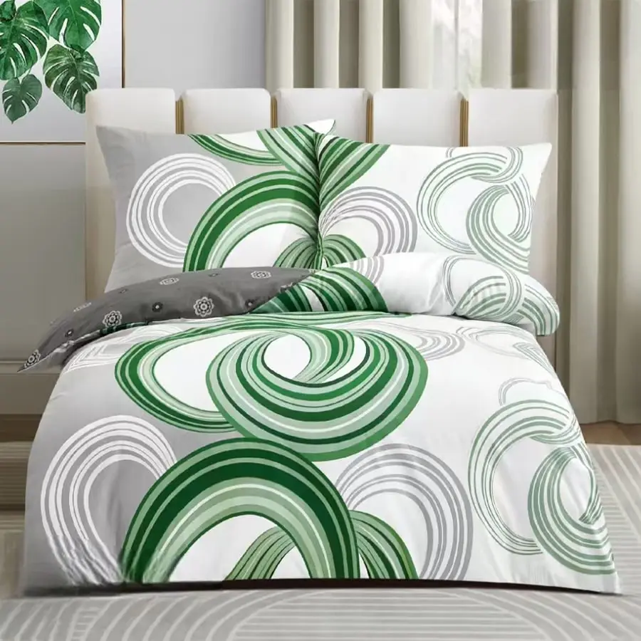Pościel bawełniana 160×200 wzór 8040 to doskonały wybór dla osób, które cenią wysoką jakość, komfort oraz stylowy wygląd sypialni. Została wykonana w 100% z bawełny o satynowym splocie, dzięki czemu jest miękka, przewiewna i przyjemna w dotyku. Przeplatające się zielone łuki w odcieniach zieleni tworzą efekt głębi i ruchu na jasnym tle. Subtelne szarości równoważą wyrazistą kolorystykę. Dodatkowo, satynowy splot subtelnie odbija światło, co nadaje pościeli lekko połyskujący, szlachetny wygląd.