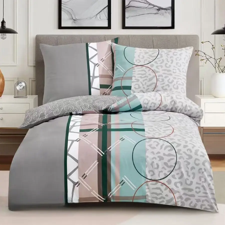 Pościel bawełniana 160×200 wzór 8043 to doskonały wybór dla osób, które cenią wysoką jakość, komfort oraz stylowy wygląd sypialni. Została wykonana w 100% z bawełny o satynowym splocie, dzięki czemu jest miękka, przewiewna i przyjemna w dotyku. Odcienie popielu i beżu łączą się z pastelową zielenią i ciemnym grafitem. Na tle geometrycznych pasów pojawiają się delikatne zwierzęce wzory i okręgi. Dodatkowo, satynowy splot subtelnie odbija światło, co nadaje pościeli lekko połyskujący, szlachetny wygląd.