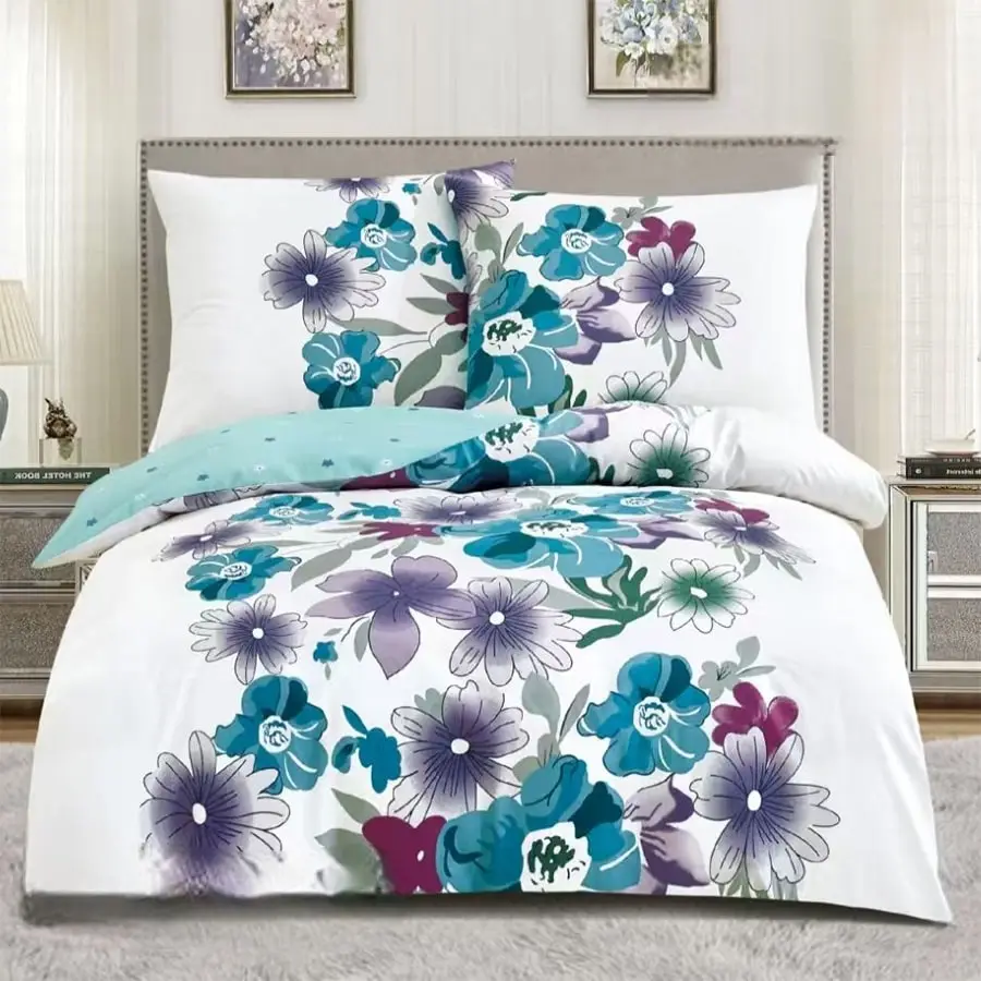 Wzór tej pościeli przedstawia bukiet dużych, efektownych kwiatów w chłodnych odcieniach błękitu i fioletu. Subtelne przejścia kolorystyczne nadają całości miękkości i harmonii. To doskonały wybór, by dodać sypialni eleganckiego charakteru.