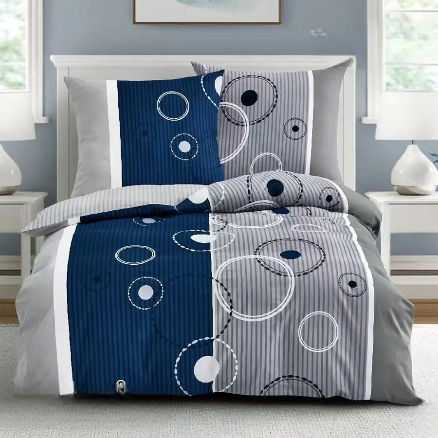 Pościel bawełniana 160×200 wzór 8047 to doskonały wybór dla osób, które cenią wysoką jakość, komfort oraz stylowy wygląd sypialni. Została wykonana w 100% z bawełny o satynowym splocie, dzięki czemu jest miękka, przewiewna i przyjemna w dotyku. Pościel utrzymana jest w eleganckiej kolorystyce granatu, szarości i bieli. Geometryczny motyw okręgów przełamuje pionowe pasy, nadając całości nowoczesnego charakteru. Dodatkowo, satynowy splot subtelnie odbija światło, co nadaje pościeli lekko połyskujący, szlachetny wygląd.