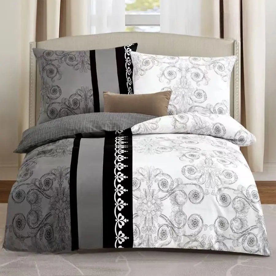 Na jasnym tle pościeli widoczny jest finezyjny motyw kwiatowy w odcieniach szarości. Geometryczne pasy w czerni i szarości podkreślają elegancję wzoru, tworząc spójną całość. To propozycja, która doskonale łączy romantyzm z minimalizmem.