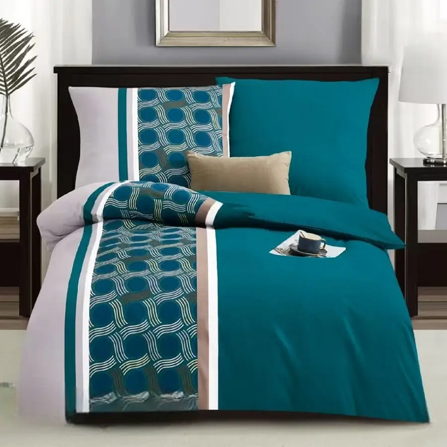 Pościel bawełniana 160×200 wzór 8050 to doskonały wybór dla osób, które cenią wysoką jakość, komfort oraz stylowy wygląd sypialni. Została wykonana w 100% z bawełny o satynowym splocie, dzięki czemu jest miękka, przewiewna i przyjemna w dotyku. Połączenie turkusu z granatem i bielą tworzy nowoczesną i wyrazistą kompozycję. Geometryczny wzór oparty na liniach nadaje całości dynamicznego charakteru. Dodatkowo, satynowy splot subtelnie odbija światło, co nadaje pościeli lekko połyskujący, szlachetny wygląd.