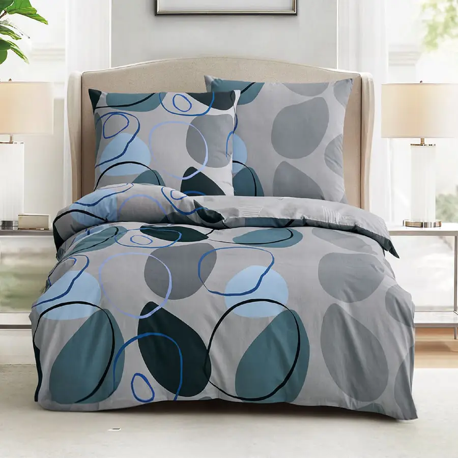 Abstrakcyjny deseń tego kompletu składa się z organicznych, nakładających się na siebie form, przypominających kamienie. Kolorystyka bazująca na szarościach i różnych tonach niebieskiego działa kojąco i sprzyja relaksowi. To stylowy motyw, który wprowadzi do sypialni atmosferę nowoczesnej elegancji.