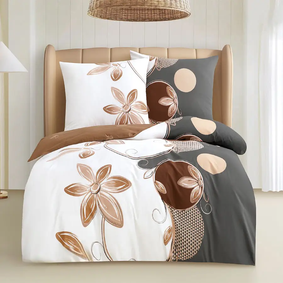 Pościel bawełniana 160×200 wzór 8056 to doskonały wybór dla osób, które cenią wysoką jakość, komfort oraz stylowy wygląd sypialni. Została wykonana w 100% z bawełny o satynowym splocie, dzięki czemu jest miękka, przewiewna i przyjemna w dotyku. Zestawienie dużych, brązowych kwiaty z graficznymi kołami na asymetrycznie podzielonym tle. Delikatne, wijące się linie łączą poszczególne elementy, tworząc spójną i płynną kompozycję.