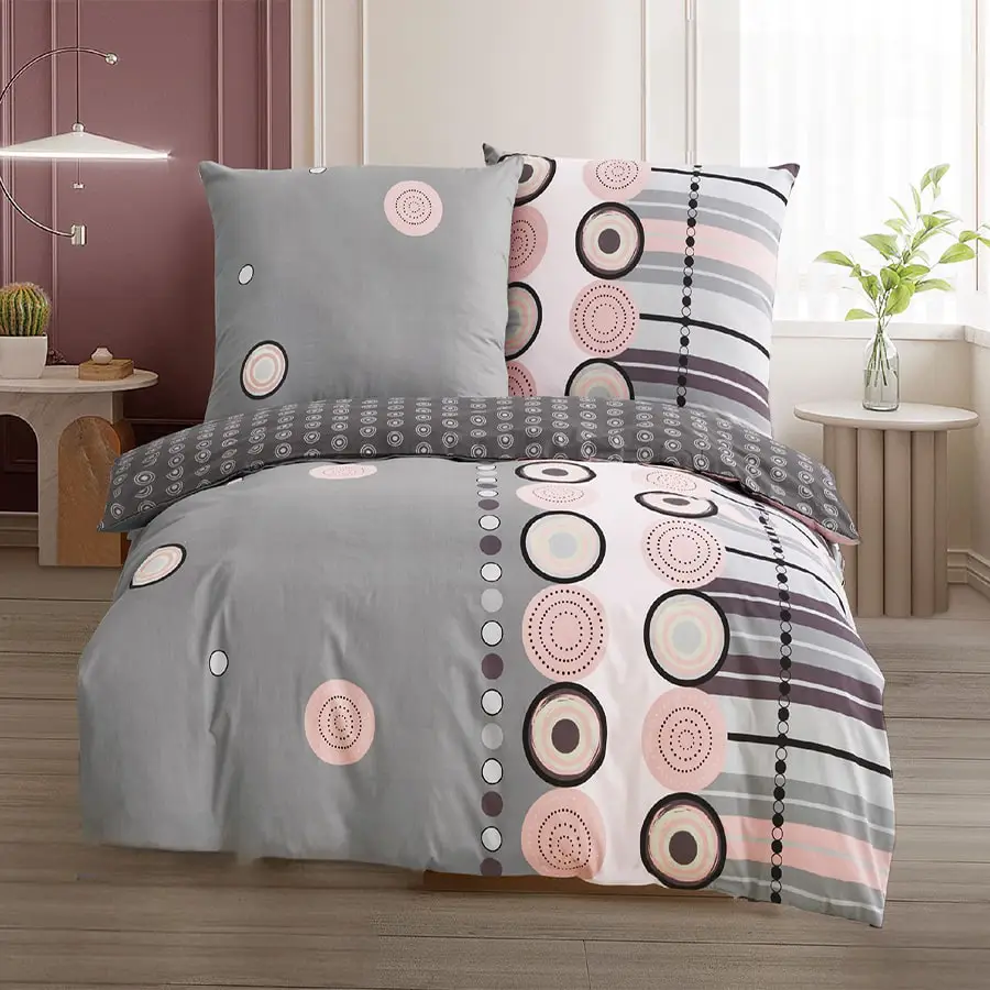 Pościel bawełniana 160×200 wzór 8062 to doskonały wybór dla osób, które cenią wysoką jakość, komfort oraz stylowy wygląd sypialni. Została wykonana w 100% z bawełny o satynowym splocie, dzięki czemu jest miękka, przewiewna i przyjemna w dotyku. Kompozycja poziomych pasów w odcieniach szarości i różu, na której umieszczono graficzne okręgi. Dla równowagi, lewa strona jest utrzymana w jednolitej szarości z nielicznymi, rozrzuconymi kołami.