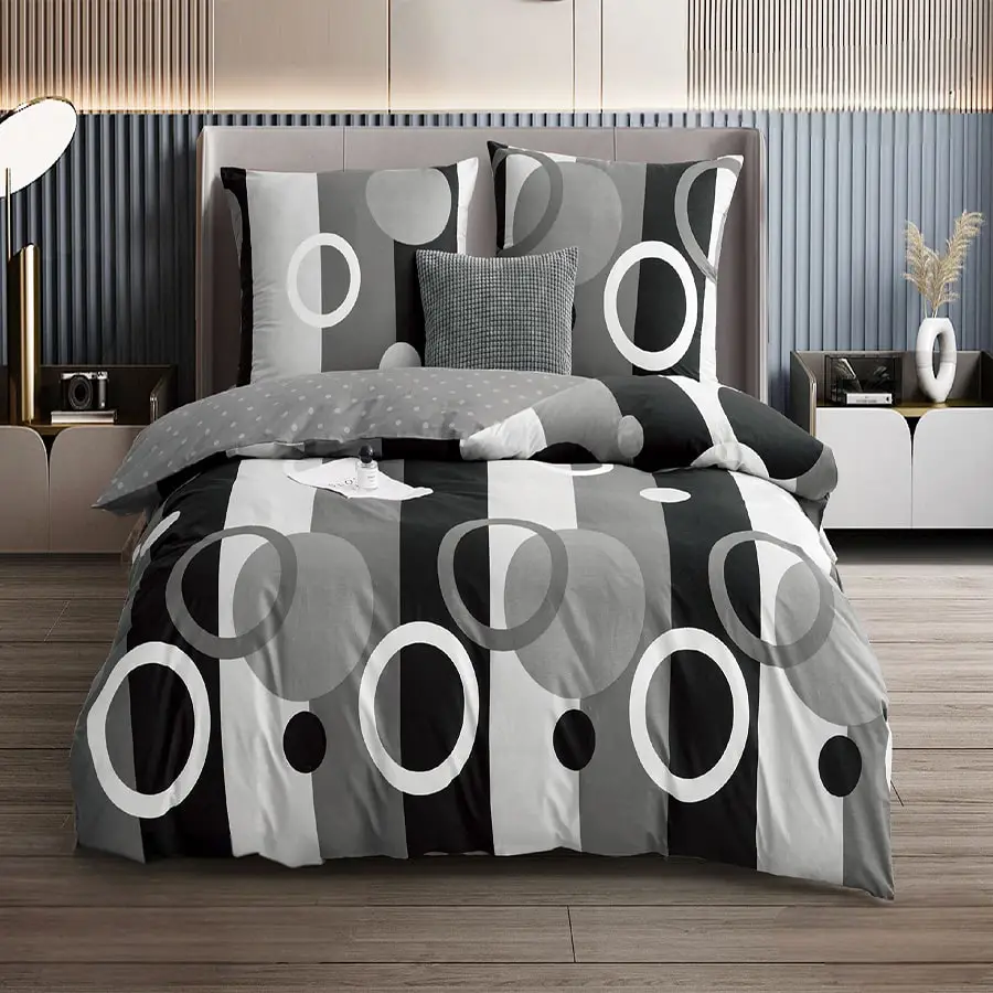 Pościel bawełniana 180×200 wzór 6323 to doskonały wybór dla osób, które cenią wysoką jakość, komfort oraz stylowy wygląd sypialni. Została wykonana w 100% z bawełny o satynowym splocie, dzięki czemu jest miękka, przewiewna i przyjemna w dotyku. Graficzny deseń tego kompletu to połączenie szerokich pasów z motywem kół i okręgów. Użycie wyłącznie czerni, bieli i szarości sprawia, że wzór jest niezwykle uniwersalny i elegancki.