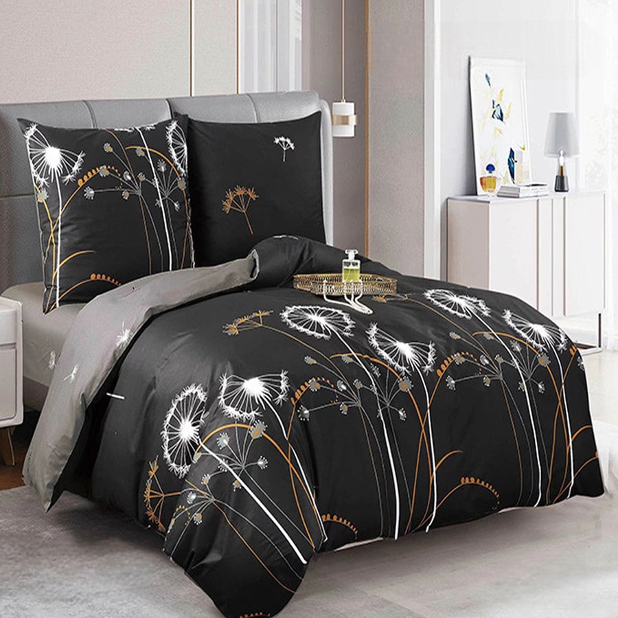 Głęboka czerń pościeli została ozdobiona eterycznym motywem dmuchawców, których puszyste główki i delikatne łodygi mienią się bielą, szarością i złotym brązem. Ten wzór to hołd dla piękna natury w nowoczesnym wydaniu.