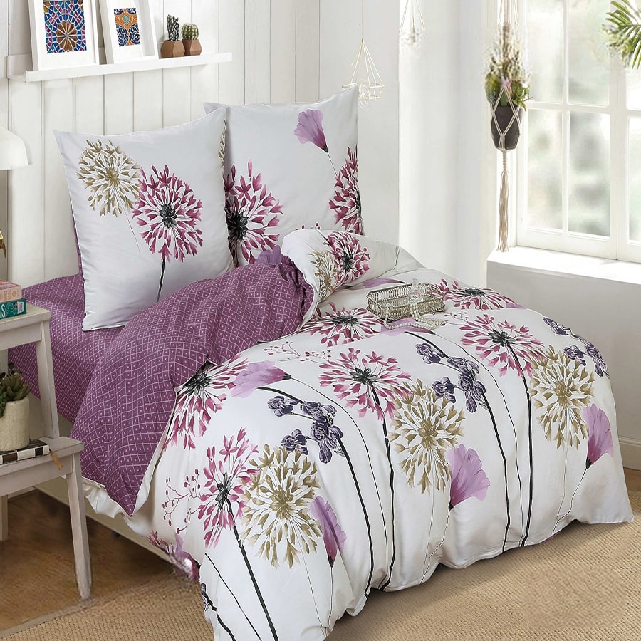 Wzorzysta strona pościeli zachwyca detalami stylizowanych kwiatostanów w modnych kolorach, takich jak fiolet, pudrowy róż i zgaszona zieleń. Druga strona to klasyczny fiolet z subtelnym deseniem, idealny do stworzenia dwustronnej aranżacji.
