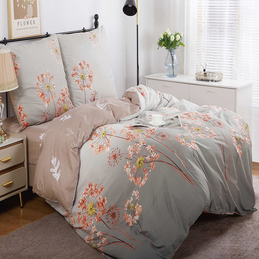 Pościel bawełniana 200×220 wzór 6249 to doskonały wybór dla osób, które cenią wysoką jakość, komfort oraz stylowy wygląd sypialni. Została wykonana w 100% z bawełny o satynowym splocie, dzięki czemu jest miękka, przewiewna i przyjemna w dotyku. Delikatne puszyste kwiaty w barwach brzoskwini i koralu rozsiane są na spokojnym, szarym tle. Uzupełnia je rewers w ciepłym odcieniu beżu z subtelnymi białymi motywami liści. Dodatkowo, satynowy splot subtelnie odbija światło, co nadaje pościeli lekko połyskujący, szlachetny wygląd.