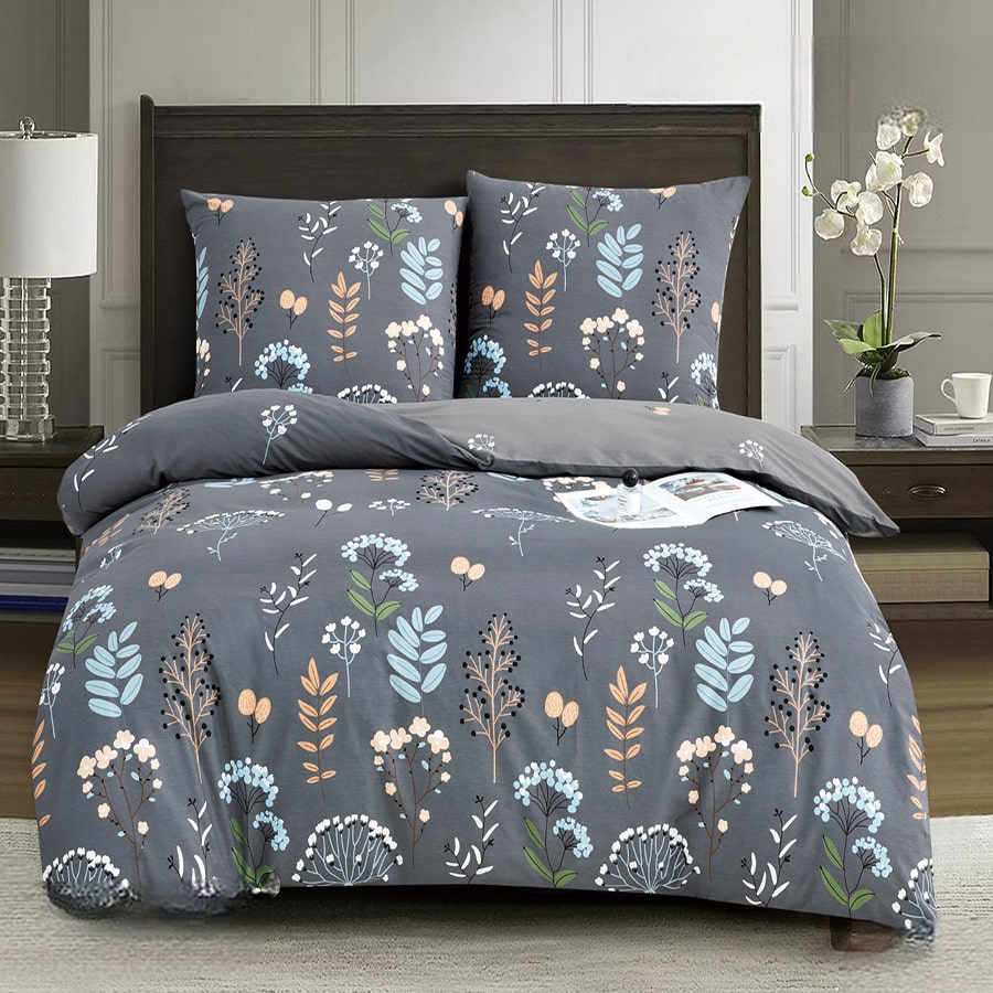 Pościel bawełniana 200×220 wzór 6291 to doskonały wybór dla osób, które cenią wysoką jakość, komfort oraz stylowy wygląd sypialni. Została wykonana w 100% z bawełny o satynowym splocie, dzięki czemu jest miękka, przewiewna i przyjemna w dotyku. Na ciemnoszarym tle rozkwita harmonijny wzór subtelnych roślin i delikatnych gałązek. Pastelowe akcenty błękitu, brzoskwini oraz bieli tworzą spokojną, naturalną kompozycję. Dodatkowo, satynowy splot subtelnie odbija światło, co nadaje pościeli lekko połyskujący, szlachetny wygląd.