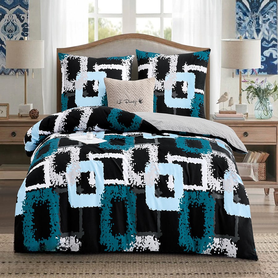 Wyrazisty wzór w nieregularne kwadraty, gdzie czerń spotyka się z turkusowym błękitem i akcentami bieli. Stwórz w sypialni atmosferę pełną miejskiego stylu i energii.