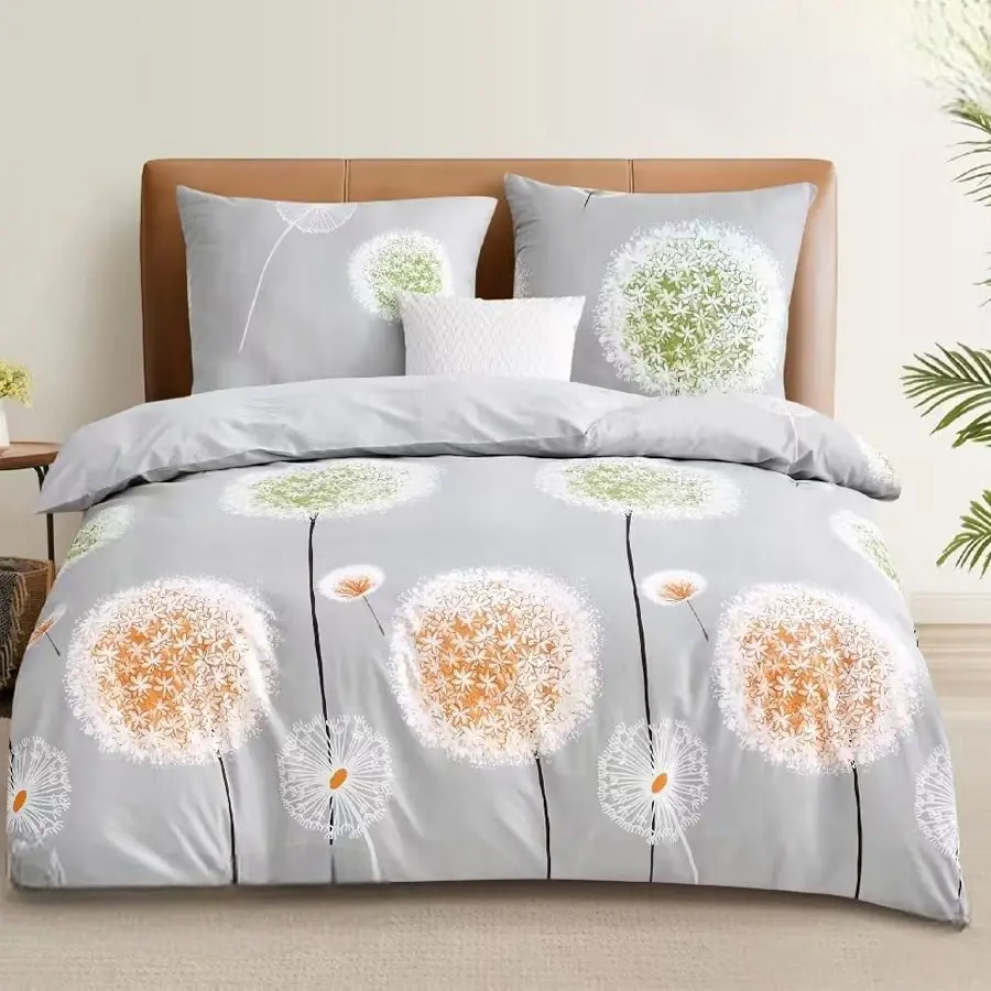 Pościel w spokojnym, szarym kolorze przyciąga wzrok wzorem puszystych dmuchawców. Zielenie i pomarańcze wypełniające kwiatowe kule nadają jej energetycznego, a jednocześnie harmonijnego charakteru. To doskonałe połączenie elegancji i natury