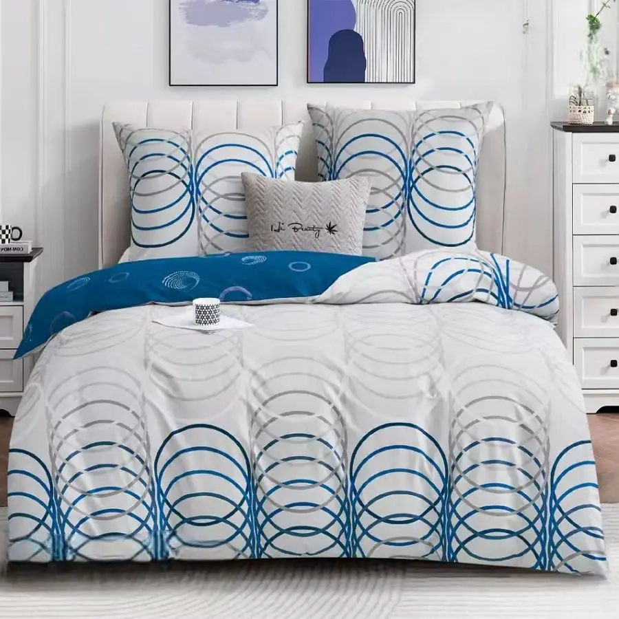 Na jasnym tle tej pościeli widnieje powtarzalny wzór koncentrycznych kół w odcieniach niebieskiego i szarego. Układ linii tworzy wrażenie głębi i nowoczesności. To idealne połączenie prostoty i wyrazistego stylu.