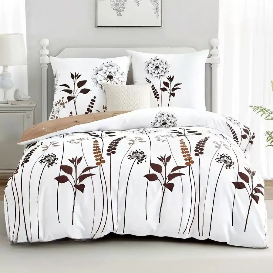 Pościel w białym kolorze ozdobiona została delikatnymi, wydłużonymi kwiatami w barwach brązu i czerni. Prosty, roślinny motyw nadaje wnętrzu naturalnego charakteru i stylowej lekkości. To wzór idealny dla osób ceniących elegancję w subtelnej formie.